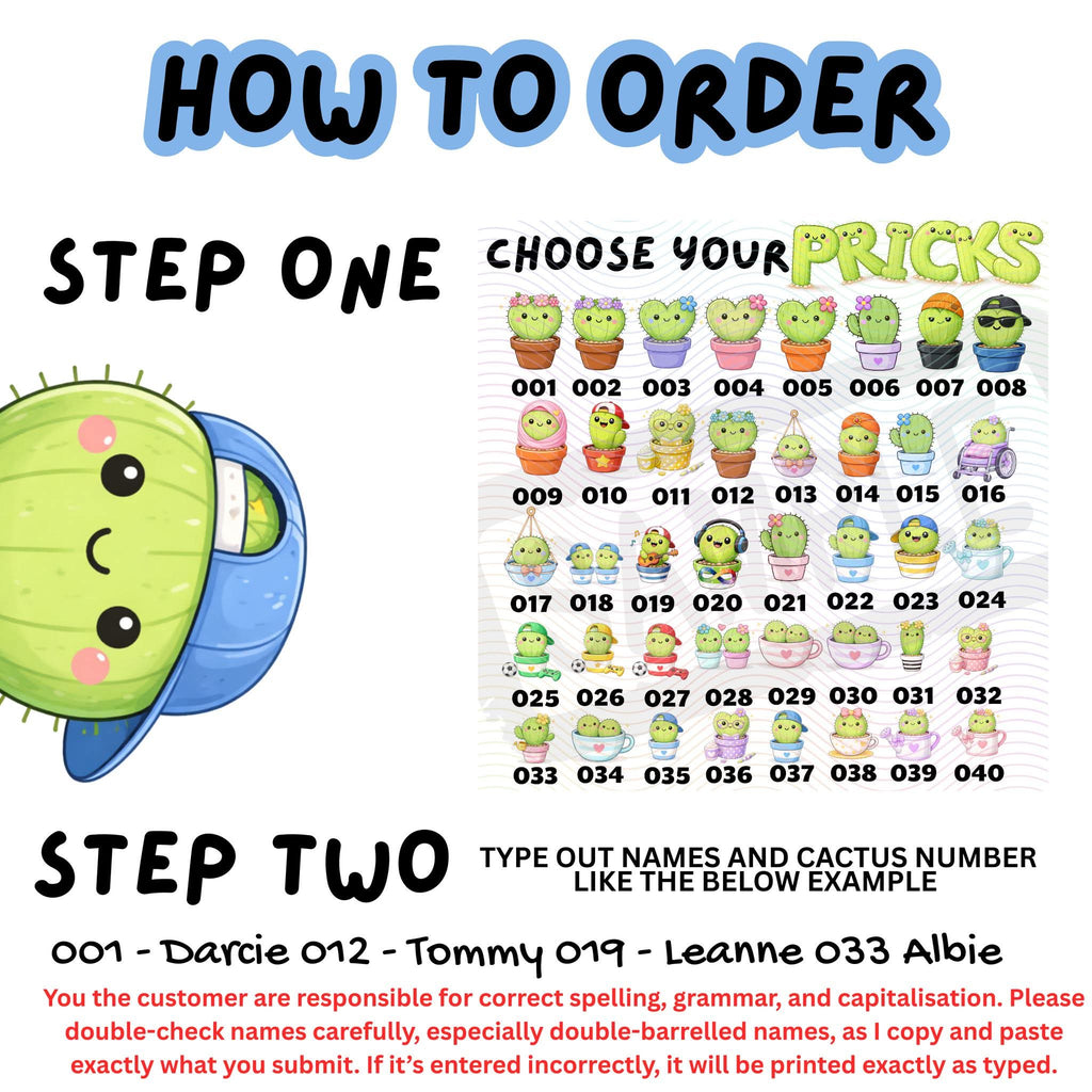• The title you would like (e.g. Mum’s Little Pricks, Nan’s Little Pricks, Dad’s Little Pricks, etc.)